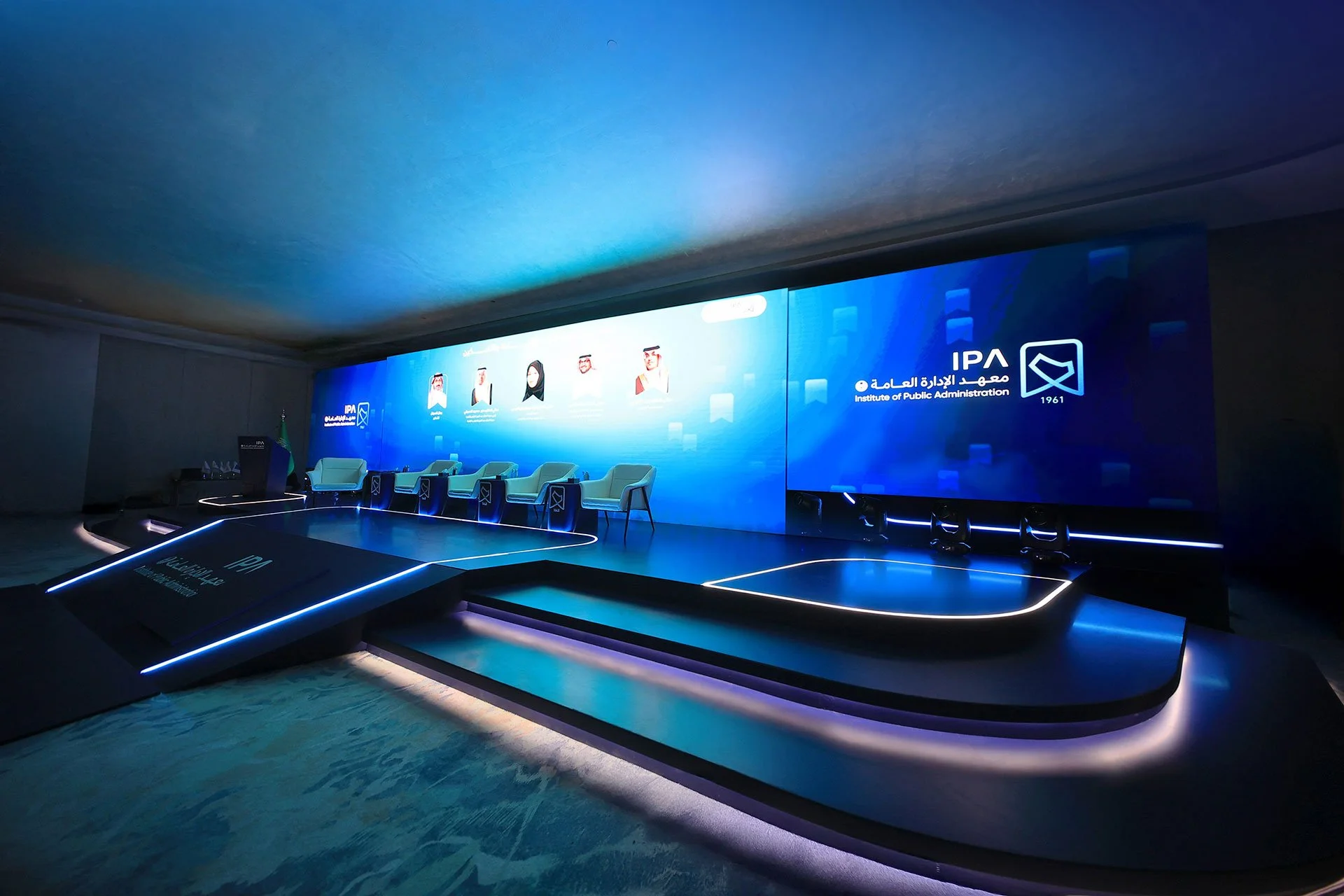 إعداد وتنفيذ حفل تدشين الهوية الجديدة لمعهد الإدارة العامة تشمل أعمال التنفيذ إنشاء المسرح الرئيسي والبوابات والمجسمات الجمالية والجدار الإعلامي. وأيضاً كافة أعمال الأنظمة والخدمات اللوجستية والتشغيلية مثل، أنظمة التسجيل والحضور، وخدمات الضيافة وأيضاً تنظيم وتوثيق الحفل طوال اليوم.